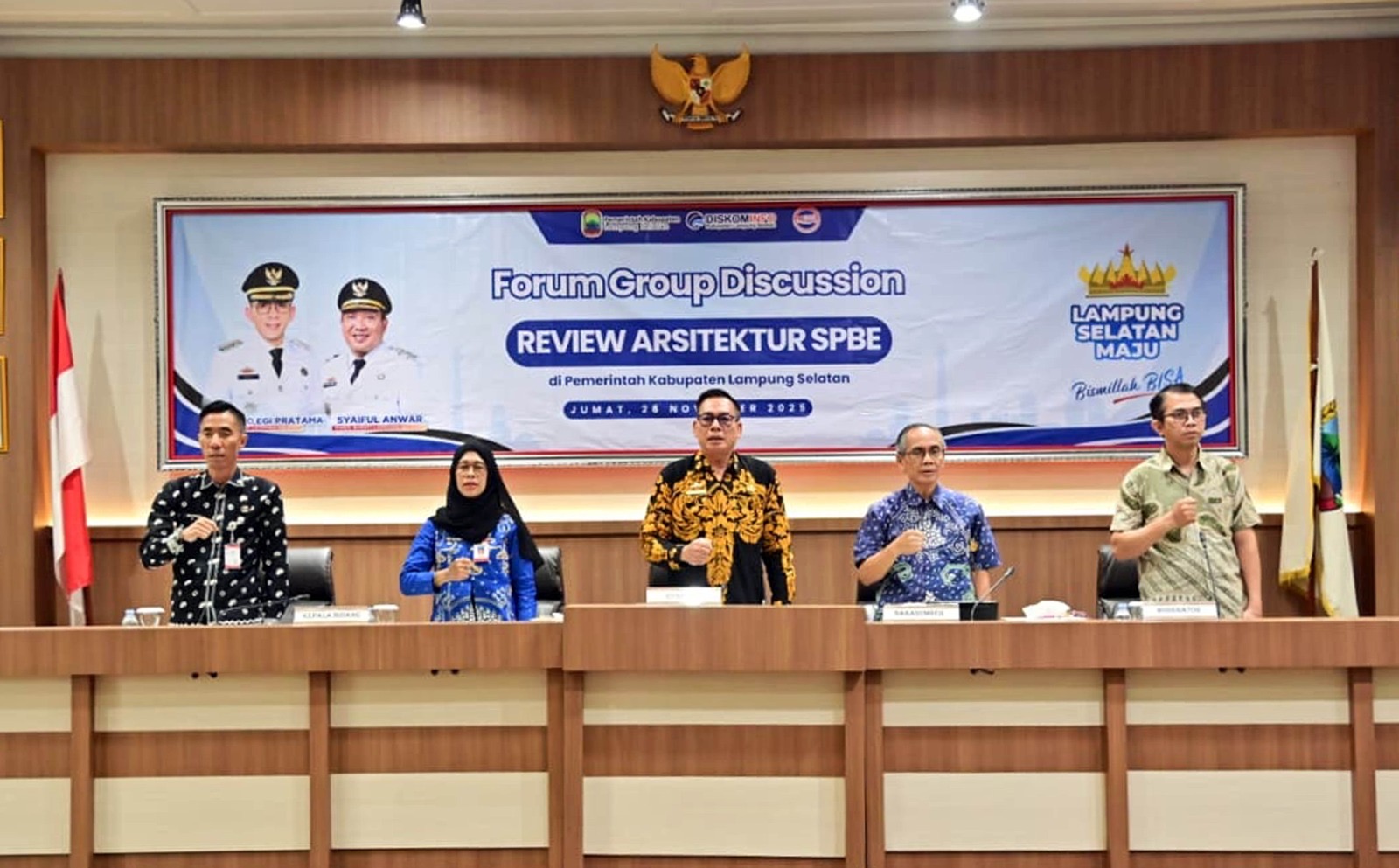 *Kalianda* - Pemerintah Kabupaten (Pemkab) Lampung Selatan melalui Dinas Komunikasi dan Informatika (Kominfo) menggelar Forum Group Discussion (FGD) Review Arsitektur Sistem Pemerintahan Berbasis Elektronik (SPBE) dan Penyusunan Arsitektur Data di Aula Rajabasa, Kantor Bupati Lampung Selatan, Jumat (28/11/2025).